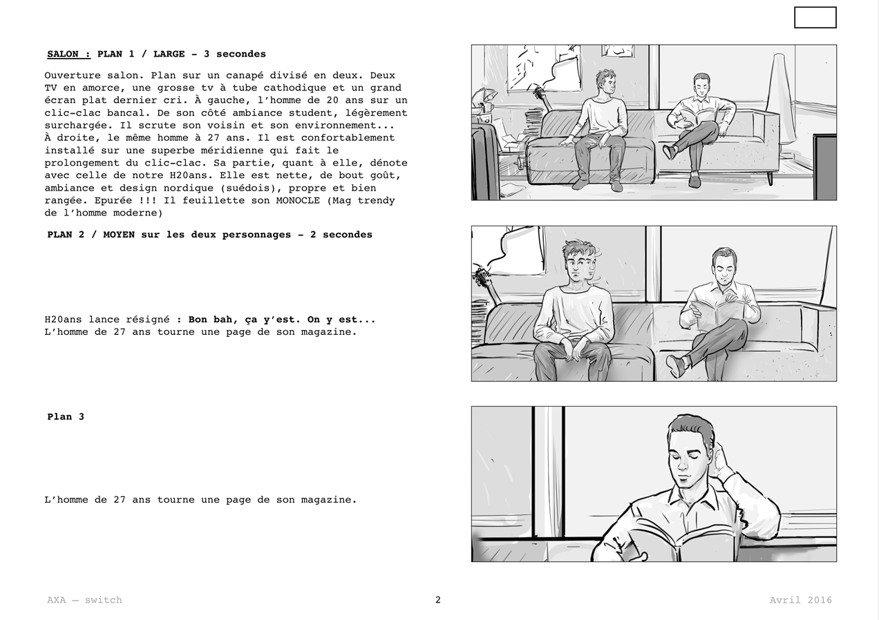 Shooting storyboard dessiné pour M6 Mobile, pour une publicité tournée à Bruxelles. Réalisateur: Marc R. Wilkins. Productions: Hush et Pacha Production.