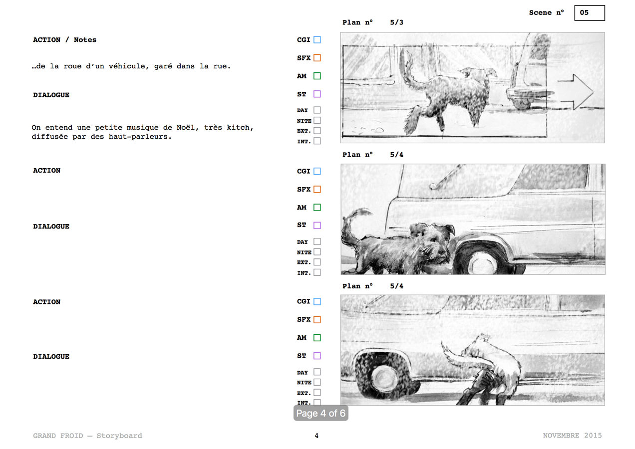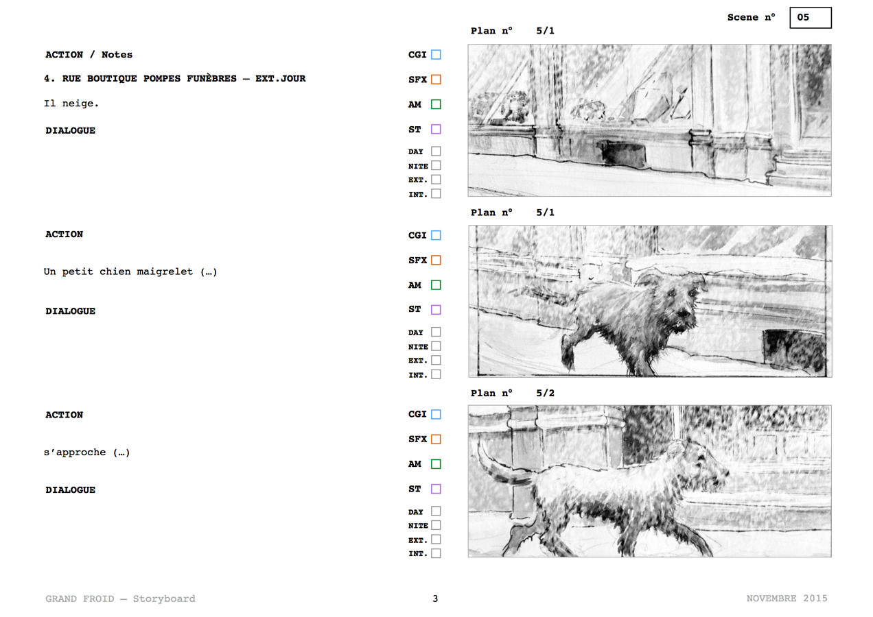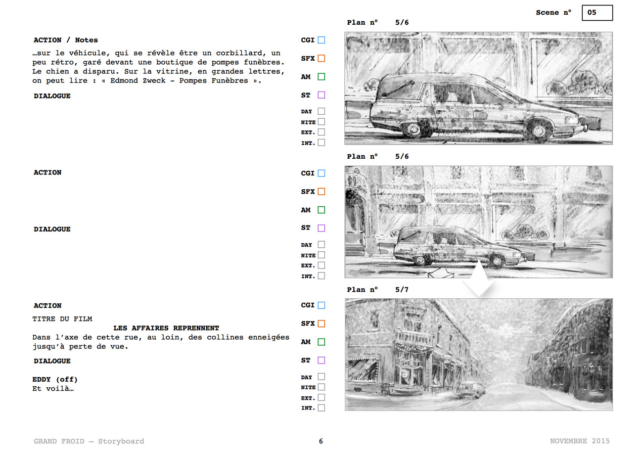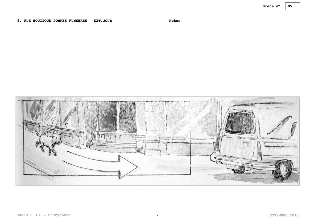 Extrait du storyboard du générique de Grand Froid. Scène du chien et du corbillard.